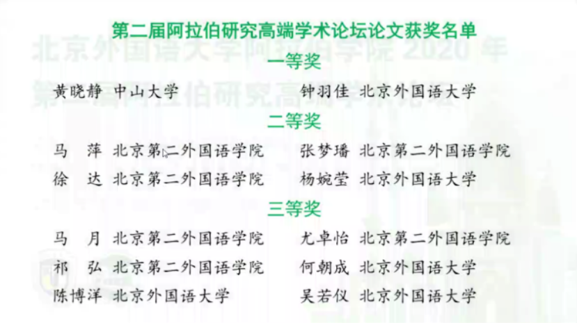Twenty excellent papers were selected out of over 100 papers, including three papers of 1st prize, six of 2nd prize and 11 of 3rd prize. Huang Xiaojing, a 2020 postgraduate student from Arabic Department of SIS, participated in the forum through Tencent Conference and read out her paper entitled The Development of Saudi Cross-border Electronic Commerce under the Background of COVID-19 pandemic". Her wonderful performance won her the third prize and the recognition of judges.