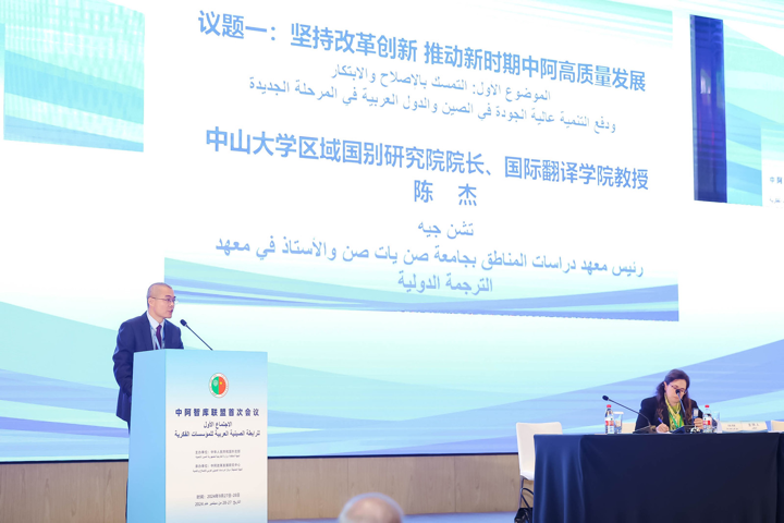 During the session on the first topic, Professor Chen Jie delivered a report titled "Think Tanks should be Contributors to China-Arab Development Cooperation."