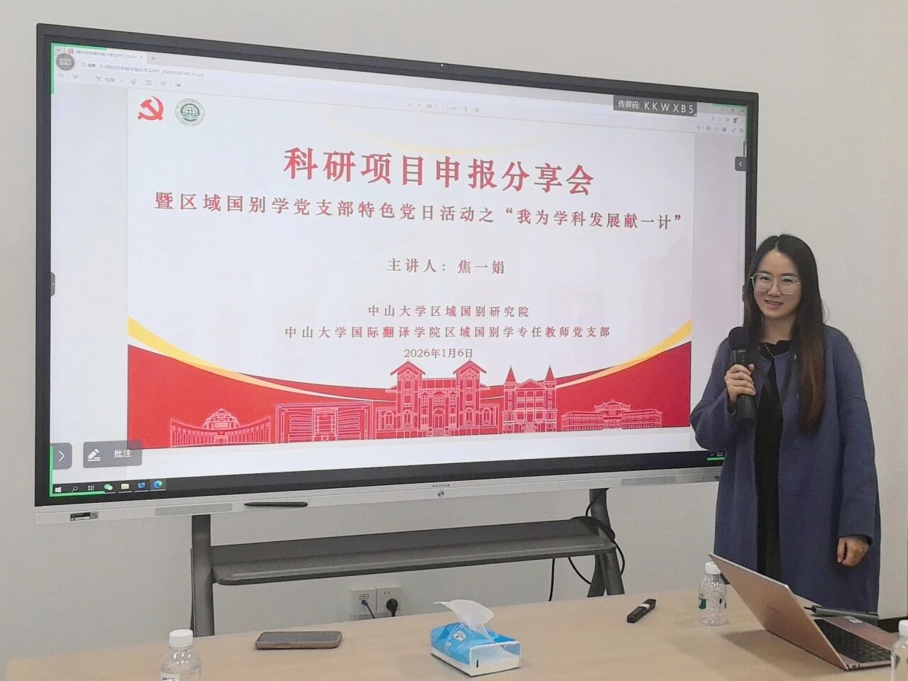 2026年1月6日晚,中山大学区域国别研究院在海琴六号A113会议室举办科研项目申报经验分享会,由2025年国家社会科学基金青年项目获得者焦一娟博士后(合作导师:陈杰教授)主讲。本次分享会旨在帮助青年学者系统了解科研项目申报的整体思路与关键环节,提升项目选题质量与申报书撰写水平,进一步推动区域国别学相关研究的高质量发展。