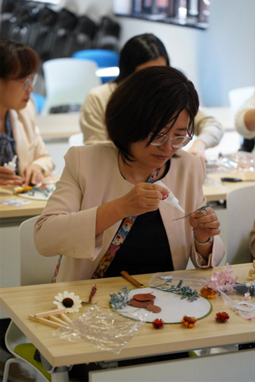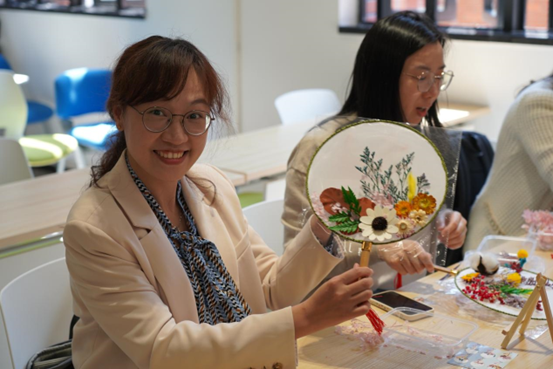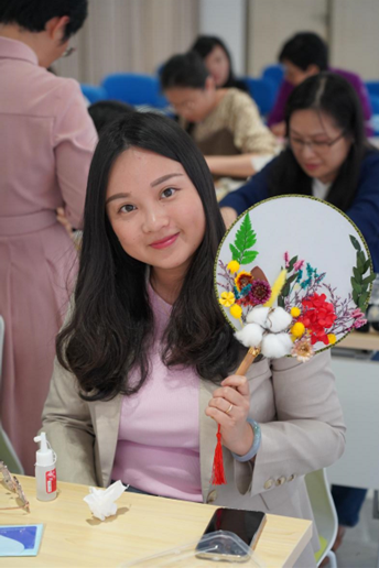 学院分工会用心筹划、精心准备,提前购置了团扇、干花、镊子、胶水等活动材料。活动中,女教职工以团扇为画纸,以干花为笔墨,尽情发挥想象力和创造力,互相交流,在欢声笑语中制作了一柄又一柄造型精美、各具特色的干花团扇,在传统文化和现代艺术的碰撞中愉悦身心、怡情冶性。活动尾声,参加活动的女教职工们手持团扇合影留念,笑脸和扇面互相映衬,在这融融春日留下了美好回忆。