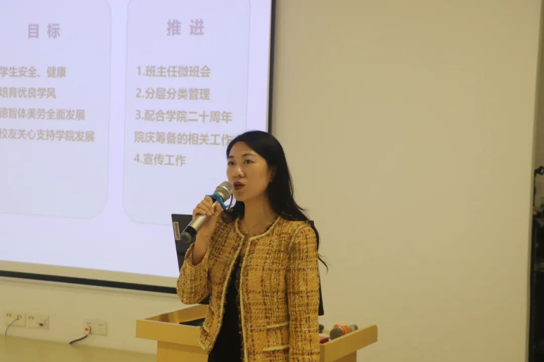 梁洁瑜副书记围绕学生、校友及宣传工作进行总结回顾,她结合学生实际需求提出工作目标,强调了学生安全、健康与培养优良学风的重要性,并继续推进班主任微班会、分层分类管理及学院二十周年院庆筹备相关工作。