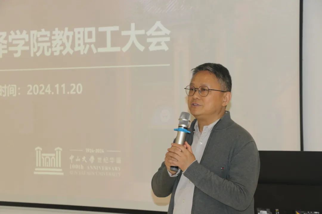 会议伊始,党委书记郑华作了题为《扎实推进十四五规划任务完成,为内涵式高质量发展打牢坚实基础》会议报告。郑华书记传达了党的二十届三中全会、全国教育大会以及习近平总书记致中山大学建校100周年贺信精神,强调学院将继续聚焦高质量发展核心问题,加大高层次人才引进力度,并在制度完善、考核评价、绩效激励等方面深化改革。郑华书记强调要弘扬教育家精神,并提出师德师风要求,对全院教职工提出“身心健康、品德高尚;志趣高雅、言行雅正;学术精进、教学精湛;勇于担当、甘于奉献”的倡议,号召全体教职工团结一心,为高质量内涵式发展凝聚力量,以优异成绩完成十四五各项任务,迎接学院二十周年院庆的到来。